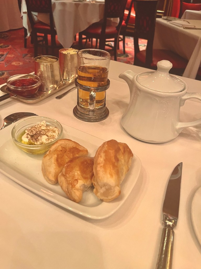 I had a corned beef sandwich with Russian dressing on rye at a deli near my hotel. Had to stop at a deli before leaving. But my wife was out to do her hair, and when she came back, she was hungry. So what was my suggestion? Let’s go back to “The Russian Tea Room” so she could have lunch and I could have tea. As a snack, alongside the tea, which I should note is a Russian blend of Chinese and Indian black teas, is ‘Pirozhki.’ Fried dumplings, with chicken, lamb, and beef. You can also add the cherries and its syrup to the tea to sweeten it. I’ll have it plain. Officially, this has become my favorite place in all of New York City. Too bad I have to leave to catch the bus in about a half hour.