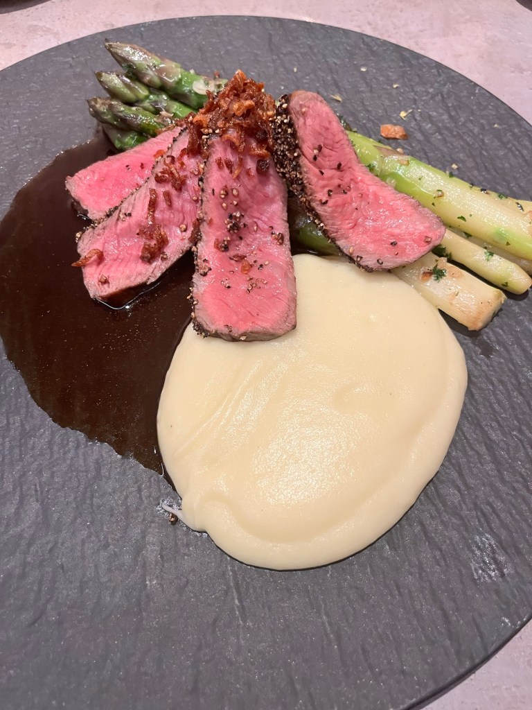 Soft and tender. The pepper crust around each slice of the steak was quite thoughtful.