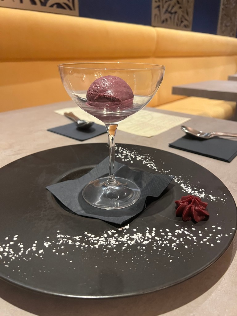But consider how thoughtful this was: as a palate cleanser after the steak and before the dessert, blueberry sorbet. You see the blueberry cream on the edge of the plate? Money.
