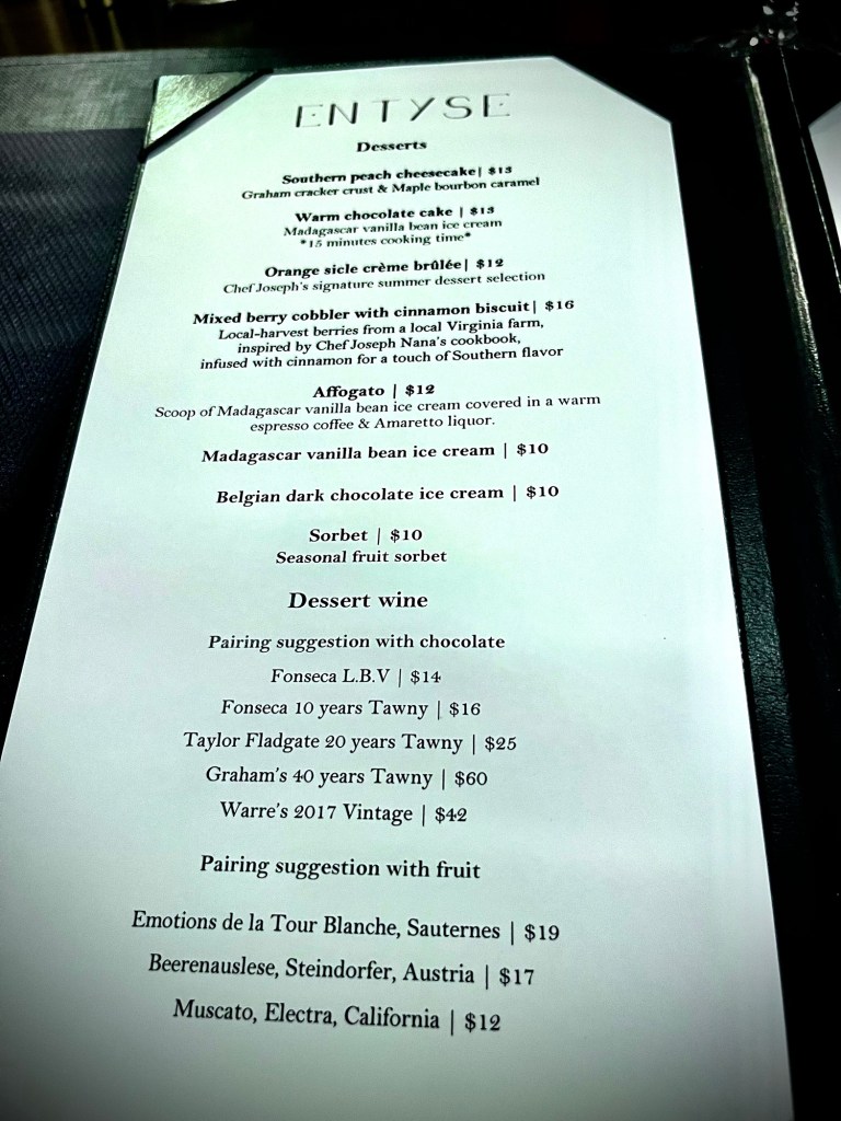 “Entyse.” Located in the lobby of the Ritz-Carlton in Tyson’s Galleria. Or “Tyson’s II” as they call it around here. There’s “Tyson’s I” and then there is “Tyson’s II.” Both are next door to one another. Down the street from one another. The former is for the masses. The latter is for bureaucrats and the elite and for rich foreign tourists. Extricate yourself from the petty culture wars somehow, and you end up here. Luxury.