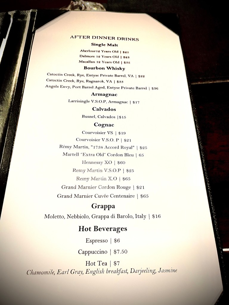 And here’s your tea and liquor menu. Since I’m driving, I’ll go with Earl Grey. No review to come. The lesson has been learned.
