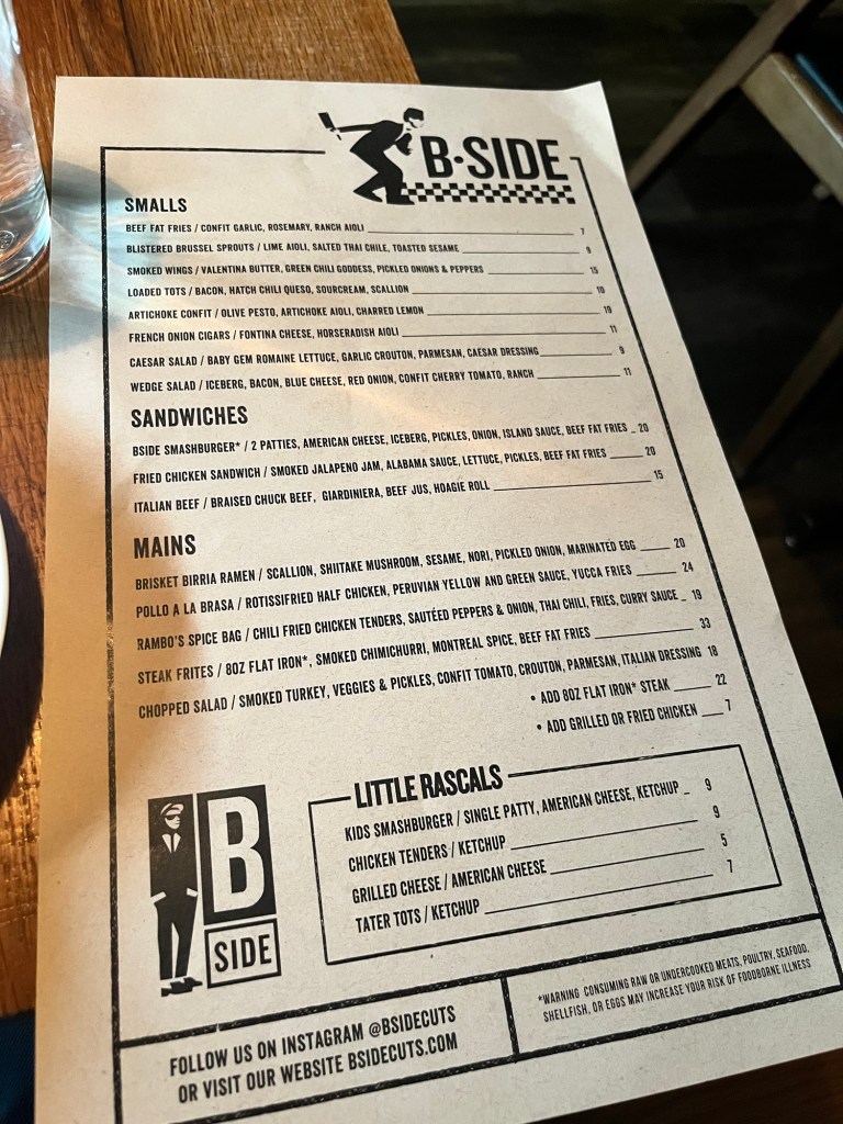 So here’s the food menu. I narrowed my choices down to the fried chicken sandwich with smoked jalapeño jam, Alabama sauce, lettuce, pickles, and beef fat fries alongside what is of course the Chicago-inspired Italian Beef sandwich (braised chuck beef, giardiniera – which is a combination of pickled veggies – and beef jus on a hoagie roll. I’m going with the Chicago-inspired Italian Beef with a small side of Caesar salad. Someone else can have the fried chicken sandwich. The review is of course next. And I’ll have the burger some other time.